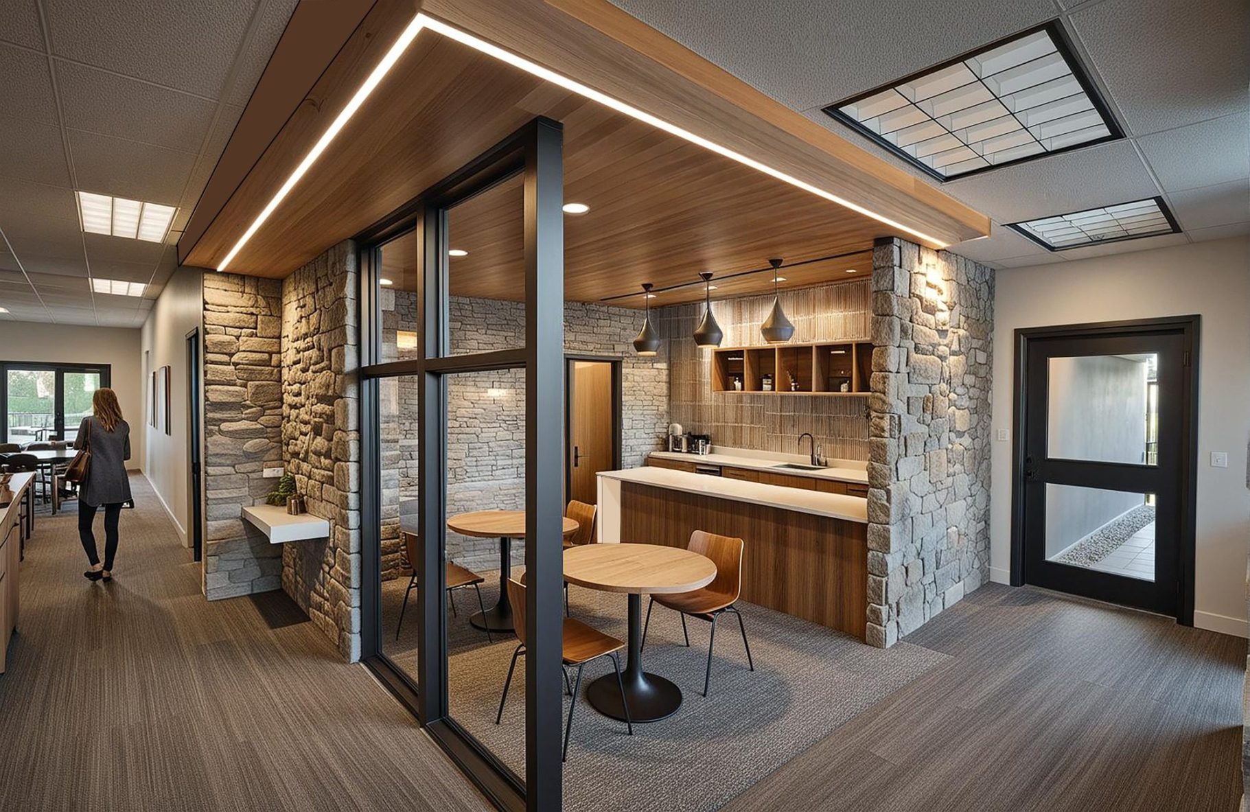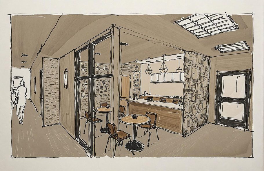 Final 3D rendering of a coffee shop. Warm colors and natural materials were used to create a relaxing environment.